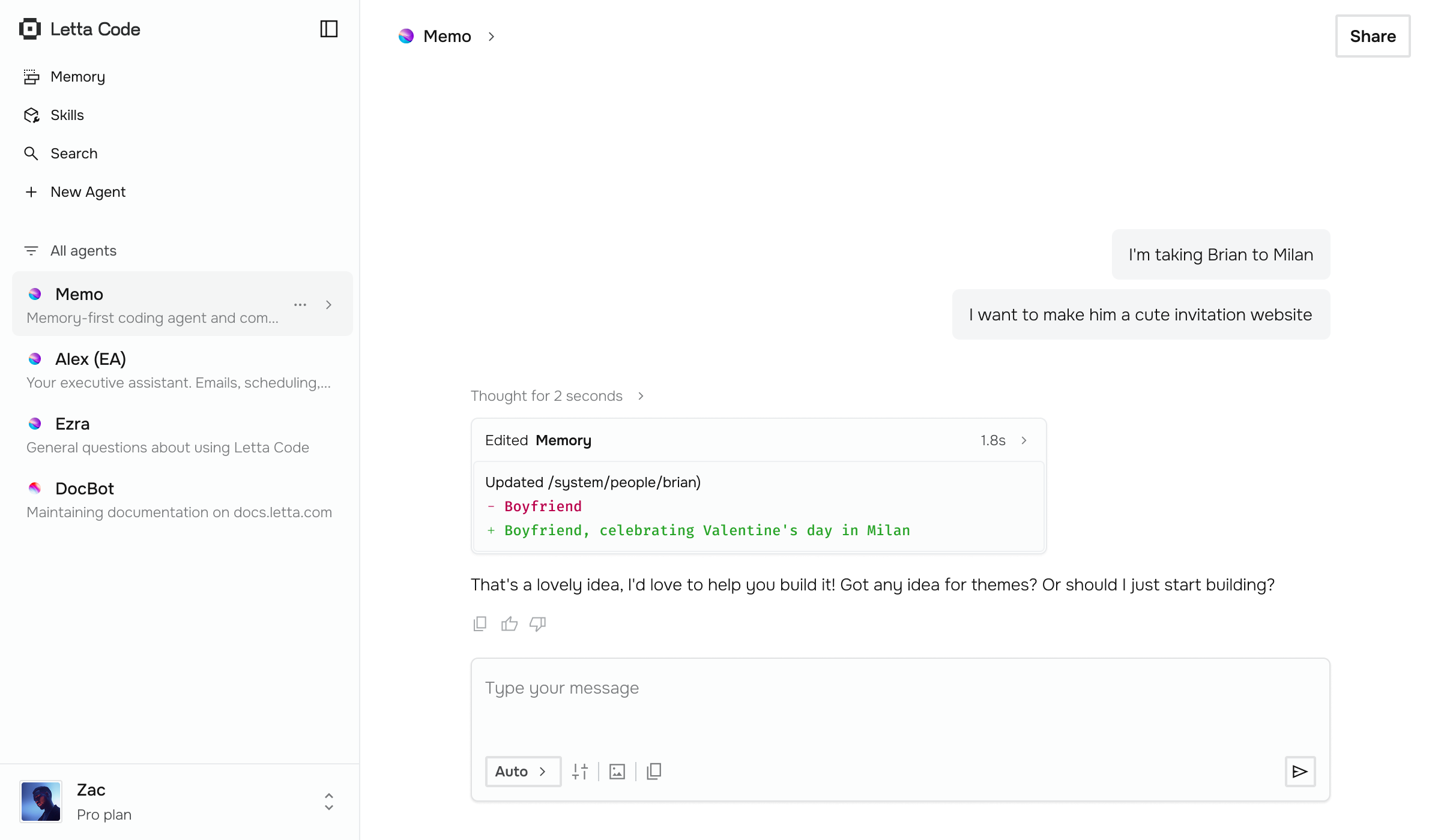 Letta Code uses background memory subagents to improve prompts, context, and skills over time with experience. View your agent's memory in the memory palace.