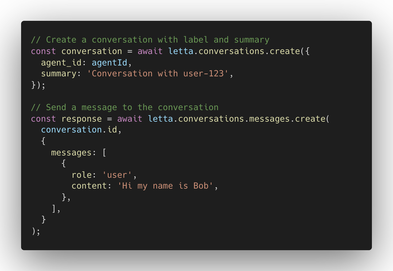With the new conversations API endpoints, agents can now have multiple conversations concurrently while still having their own individual identity and sense of experience. Each conversation is tied to a specific agent, and experiences within a conversation can form memories which transfer across all conversations.