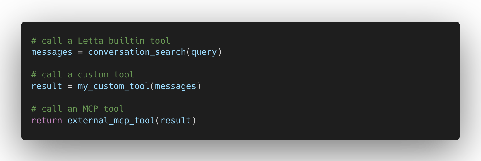 - Built-in tools (memory/filesystem/utility tools supported by Letta)