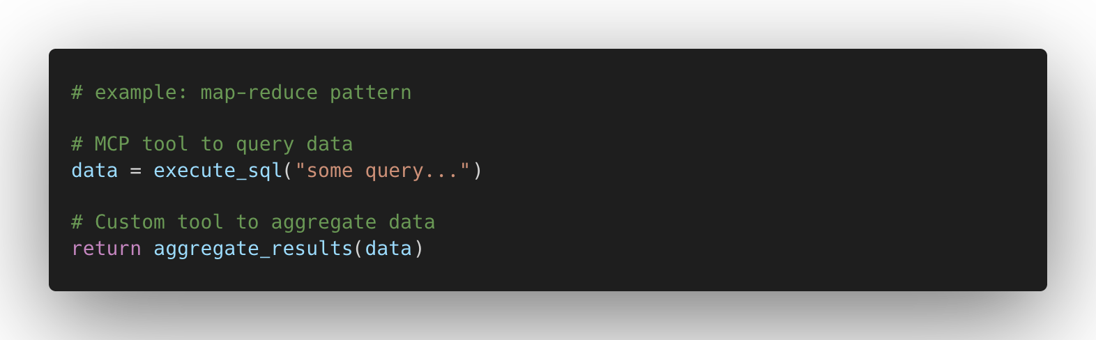 to define a map-reduce workflow pattern that composes tools. Combined with skills (which can store code snippets defining workflows), this allows general-purpose agents to execute pre-defined workflows similar to standard LLM frameworks.